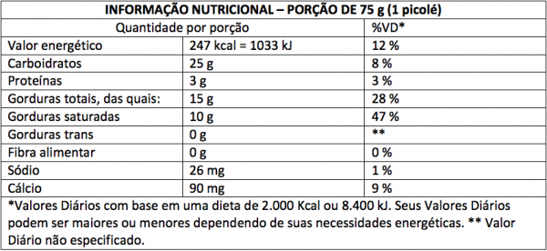 Água, açúcar cristal, leite em pó integral, glicose de milho em pó, gordura vegetal, cacau em pó, extrato de malte em pó, chocolate ao leite (óleo vegetal, açúcar, cacau em pó, soro de leite desmineralizado, estabilizante lecitina de soja (INS 322), polirricinoleato de poliglicerol (INS 476) e aromatizante), amendoim torrado granulado, emulsificantes mono e diglicerídeos de ácidos graxos comestíveis (INS 471), emulsificante goma guar (INS 412), espessante carboximetilcelulose de sódio (INS 466), espessante carragena (INS 407) e maltodextrina. ALÉRGICOS: CONTÉM LEITE, DERIVADOS DE LEITE E SOJA E AMENDOIM. CONTÉM LACTOSE. CONTÉM GLÚTEN.
