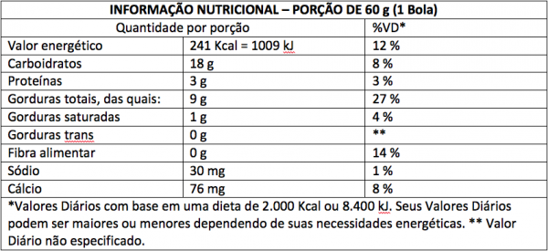 Água, açúcar cristal, castanha de caju torrada, leite em pó integral, fécula de mandioca, coco natural ralado, glicose de milho em pó, gordura vegetal, extrato de malte em pó, cacau em pó alcalino, emulsificantes mono e diglicerídeos de ácidos graxos comestíveis (INS 471), emulsificante goma guar (INS 412), espessante carboximetilcelulose de sódio (INS 466), espessante carragena (INS 407) e maltodextrina. ALÉRGICOS: CONTÉM LEITE E CASTANHA DE CAJU. CONTÉM LACTOSE. NÃO CONTÉM GLÚTEN.