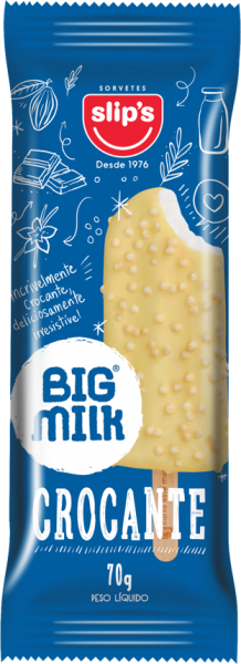 Picolé sabor de baunilha, com cobertura sabor de chocolate branco e flocos de arroz, colorido e aromatizado artificialmente.