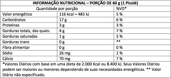 Água, açúcar cristal, leite em pó integral, glicose de milho em pó, gordura vegetal, aroma artificial de leite condensado, corantes artificiais amarelo tartrazina (INS 102) e amarelo crepúsculo (INS 110), emulsificantes mono e diglicerídeos de ácidos graxos comestíveis (INS 471), emulsificante goma guar (INS 412), espessante carboximetilcelulose de sódio (INS 466), espessante carragena (INS 407) e maltodextrina. ALÉRGICOS: CONTÉM LEITE. CONTÉM LACTOSE. CONTÉM GLÚTEN.