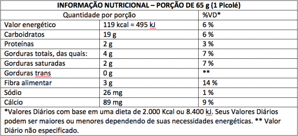 Água, açúcar cristal, leite em pó integral, polpa de maracujá, xarope de glicose de milho, gordura vegetal, preparado de maracujá (polpa de maracujá, açúcar cristal, xarope de glicose de milho, ácido cítrico), ácido cítrico, corantes artificiais amarelo tartrazina (INS 102) e amarelo crepúsculo (INS 110), emulsificantes mono e diglicerídeos de ácidos graxos comestíveis (INS 471), emulsificante goma guar (INS 412), espessante carboximetilcelulose de sódio (INS 466), espessante carragena (INS 407) e maltodextrina. ALÉRGICOS: CONTÉM LEITE. CONTÉM LACTOSE. CONTÉM GLÚTEN.